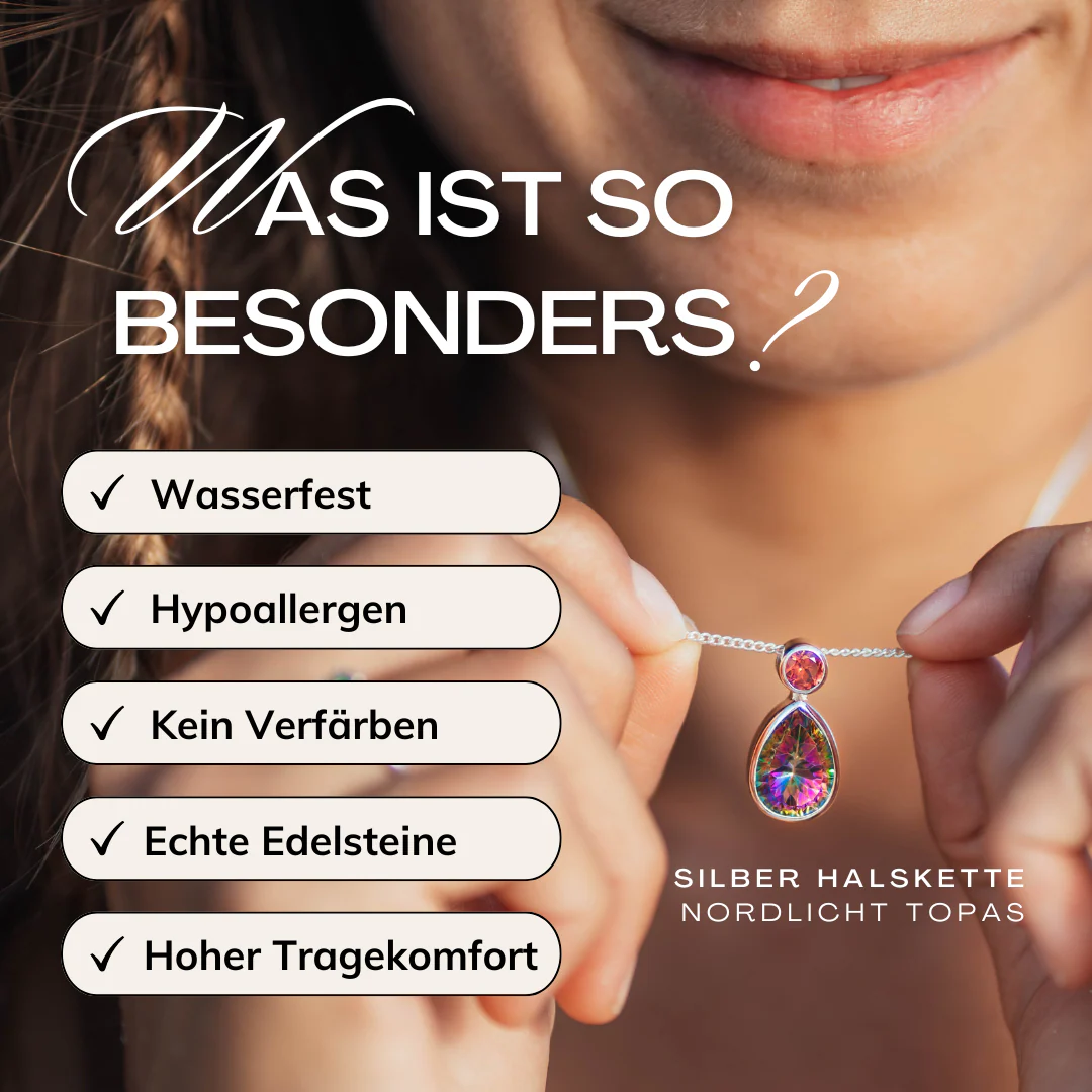 Der mystische Topas schillert in prismatischen Regenbogentönen, deren Farbspiel sich bei der kleinsten Bewegung verändert. Begleitet von einem perfekt geschliffenen eleganten pinken Turmalin, erinnert diese Halskette an den wunderschönen Anblick der Nordlichter. Ein absoluter Hingucker, der seines gleichen sucht!