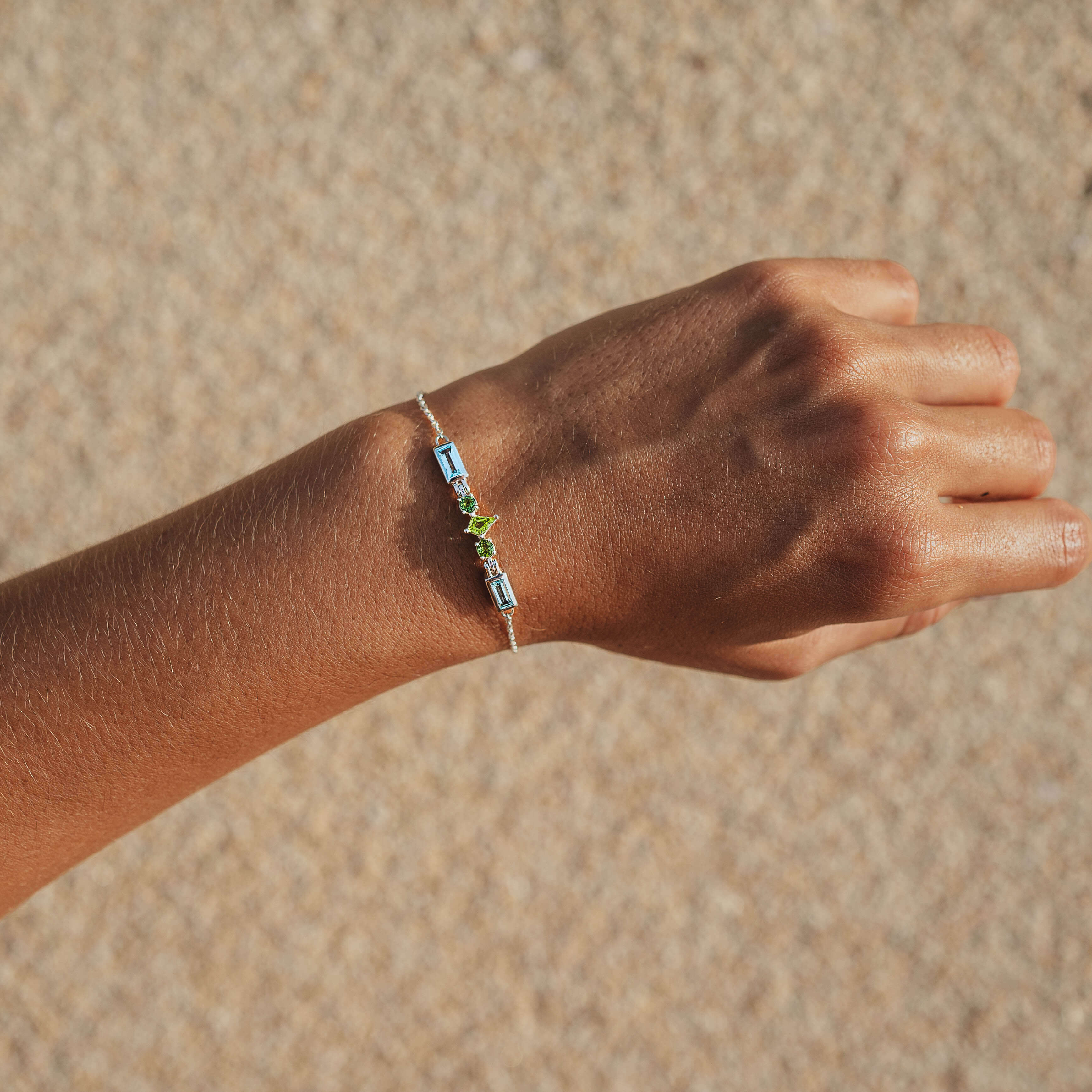 Eine perfekte Harmonie, die durch eine Mischung aus leuchtend grünem Peridot, zwei leicht dunkleren grünen Turmalin sowie einem beruhigenden Blau zweier Topas erzeugt wird. Wunderschön handgefertigt in Krappenfassung aus Sterling Silber.