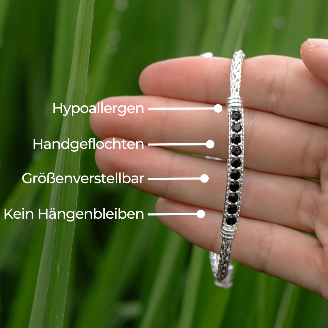Dieses Armband verströmt die kraftvolle Energie des schwarzen Onyx, der für seine Schutzwirkung und Fähigkeit, negative Energien abzuwenden, bekannt ist. Zehn echte Onyxsteine sind in einer edlen Pave-Fassung eingefasst, die nicht nur die Steine sicher hält, sondern auch verhindert, dass das Armband an Kleidung hängen bleibt. Der stufenlos verstellbare Verschluss sorgt für eine ideale Passform und höchsten Komfort. Das nickelfreie Sterling Silber garantiert Langlebigkeit und Hautfreundlichkeit.