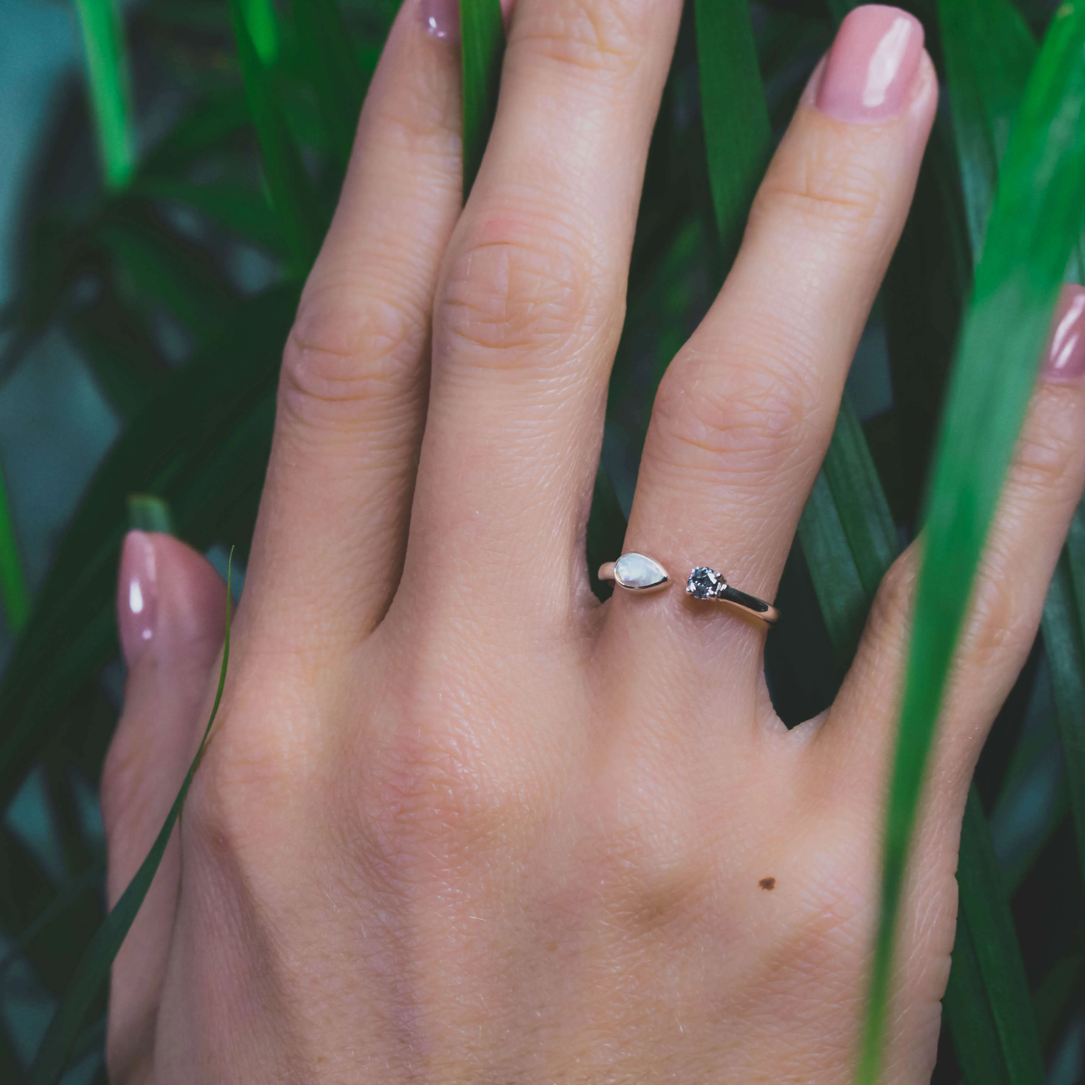 Ein strahlender australischer Opal in grün-blauem Feuer trifft auf den faszinierenden Glanz eines Salz- und Pfefferdiamanten. Opals Transluzenz und der funkelnde Diamant bilden eine visuelle Symphonie, die verzaubert. Erwecke deine Sinne mit diesem einzigartigen Ring!