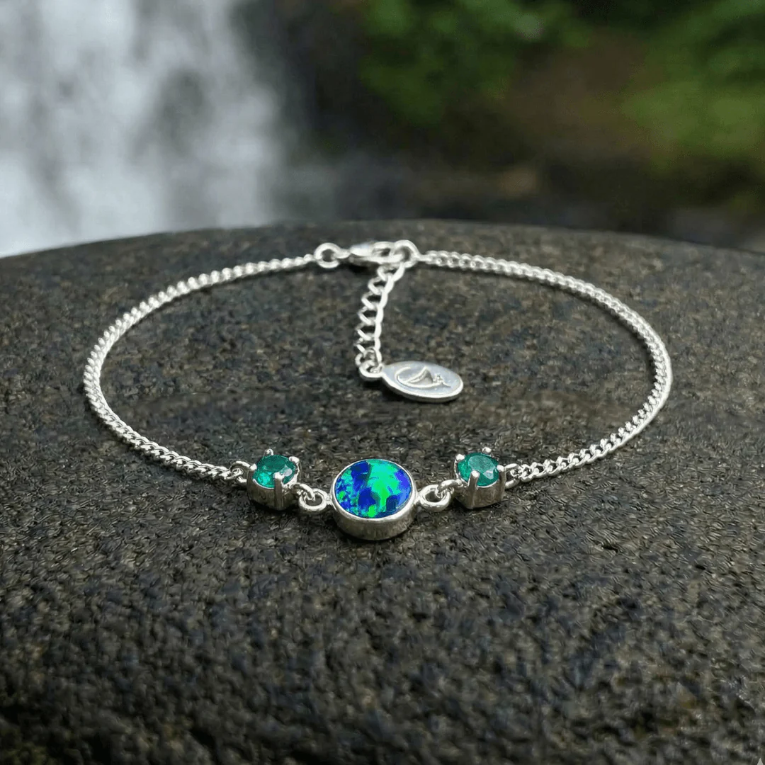 Dieses Silberarmband lässt auf den ersten Blick erkennen, dass es kein "Schmuckstück von der Stange" ist. Der australische Opal, gepaart mit zwei tiefgrünen Smaragden aus Sambia, sorgen für einen atemberaubenden Anblick. Staunende Blicke & ehrliche Komplimente werden beim Tragen dieses Armbands keine Seltenheit bleiben.