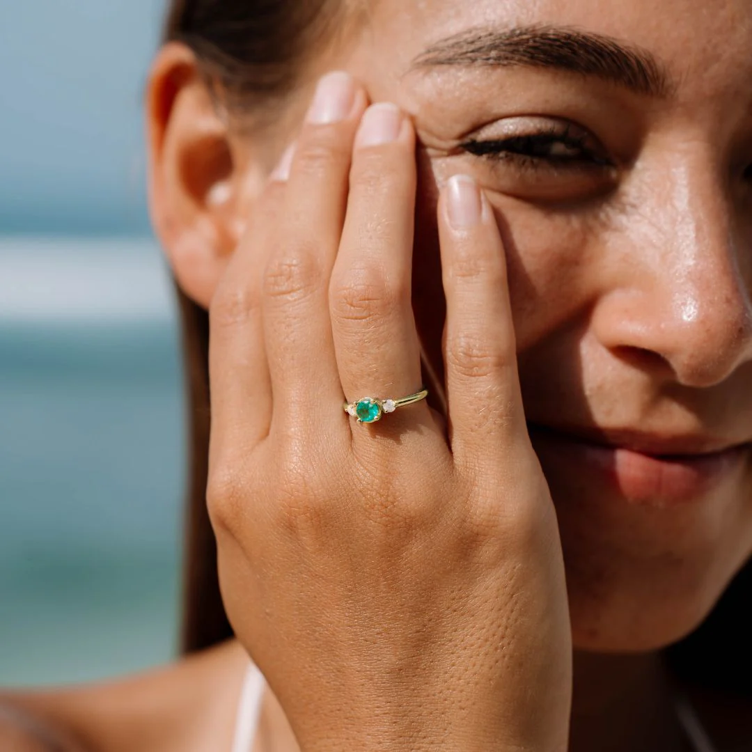 Der Smaragd entfaltet eine unverwechselbare Ausstrahlung: lebendig, geheimnisvoll, voller Tiefe – wie die Liebe, die Du mit ihr teilst. Zwei Salz & Pfeffer Diamanten sorgen für das gewisse Funkeln und machen den Ring zu einem modernen Statement voller Charakter und Eleganz.