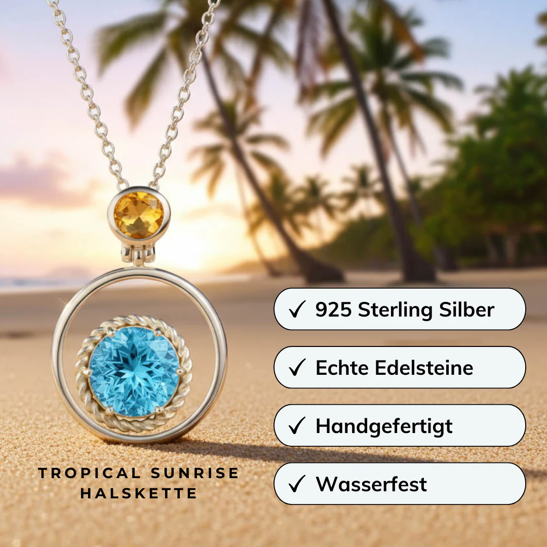 Fein geschliffener, tiefblauer Topas & lebendiger Citrin vereinen sich zu einem unverwechselbaren Farbspiel, das an einen tropischen Sonnenaufgang erinnert. Der Anhänger besticht durch seine aufwendigen Details und verleiht jedem Outfit einen Hauch von Luxus & Eleganz. Egal ob als tägliches Accessoire oder als Schmuckstück für den schönsten Tag im Leben - diese exklusive Halskette wird alle Blicke auf Dich ziehen. Mit Liebe entworfen und von erfahrenen Handwerkern auf Bali gefertigt, ist sie ein wahres Kunstwerk.